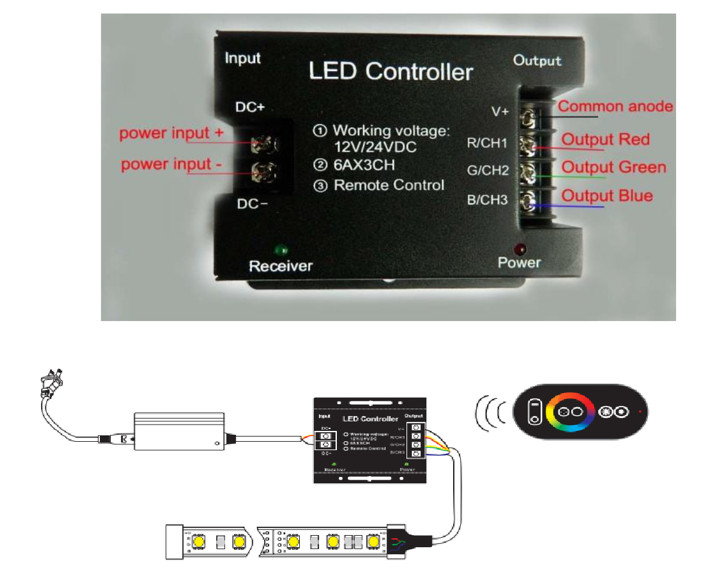 The receiver unit features clear terminal blocks for easy wiring of the common anode and three output channels (Red, Green, Blue).