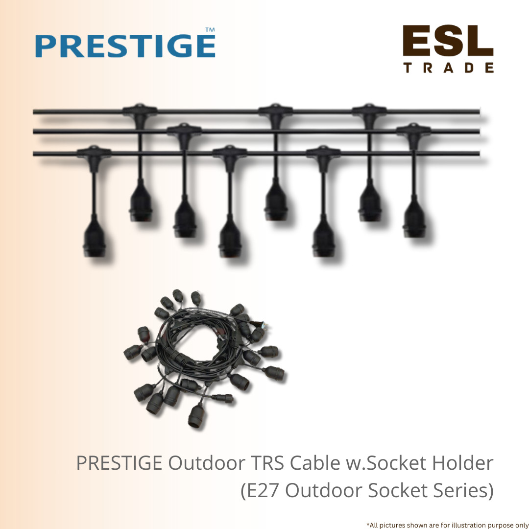 The Prestige E27 Outdoor Socket TRS Cable is a premium-grade lighting solution designed to provide reliable power and illumination in the most demanding exterior environments.
