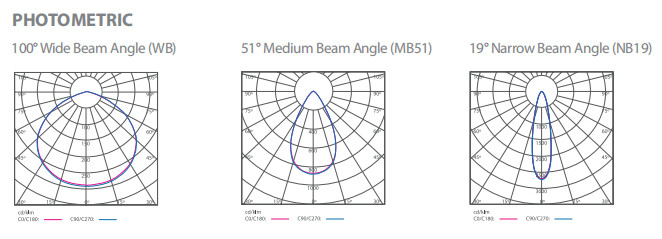 Versatile Optics: Multiple beam angle options available: Wide Beam (100°), Medium Beam (51°), and Narrow Beam (19°).