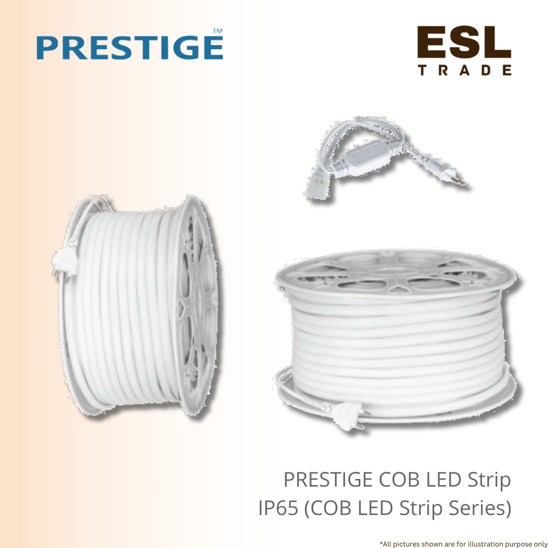 The Prestige IP65 COB LED Strip light is a professional-grade 50-meter lighting solution that delivers uniform, dot-free light for high-end interior and exterior applications. Featuring a durable silicon and double-layer copper construction, this AC240V high-density tape offers a bright output of >1000lm/W and is rated for a 15,000-hour lifespan. With an IP65 waterproof rating, no blue light hazard certification, and a wide variety of colors ranging from warm white to RGB, it provides a safe, energy-efficient, and easy-to-install lighting choice for any architectural or decorative project.