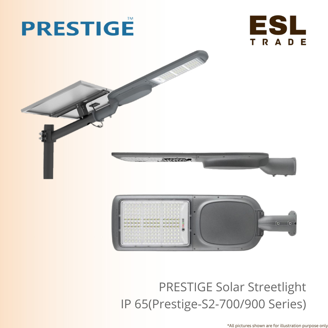 Prestige S2 Series IP65 Solar LED Streetlight (700W-900W) High-Power Outdoor Security Road Light with 65000mAh LiFePO4 Battery, Integrated Solar Panel, and Adjustable Fitting