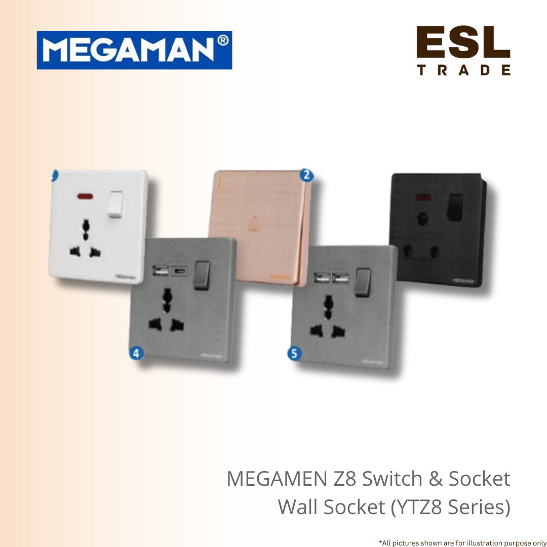 The MEGAMAN® Z8 Wall Socket series features an elegant 3D checkered brushed panel with a unique Tartan Texture Design and a modern frameless large panel construction. This MS-certified series offers a variety of configurations, including 13A Universal and 15A sockets with Neon indicators, as well as integrated USB and Type-C fast-charging ports (5V/2.1A). Engineered for maximum safety with child protection and fatigue-resistant phosphorus copper, these durable sockets are available in Black, Gold, White, and Gray to complement any high-end interior.