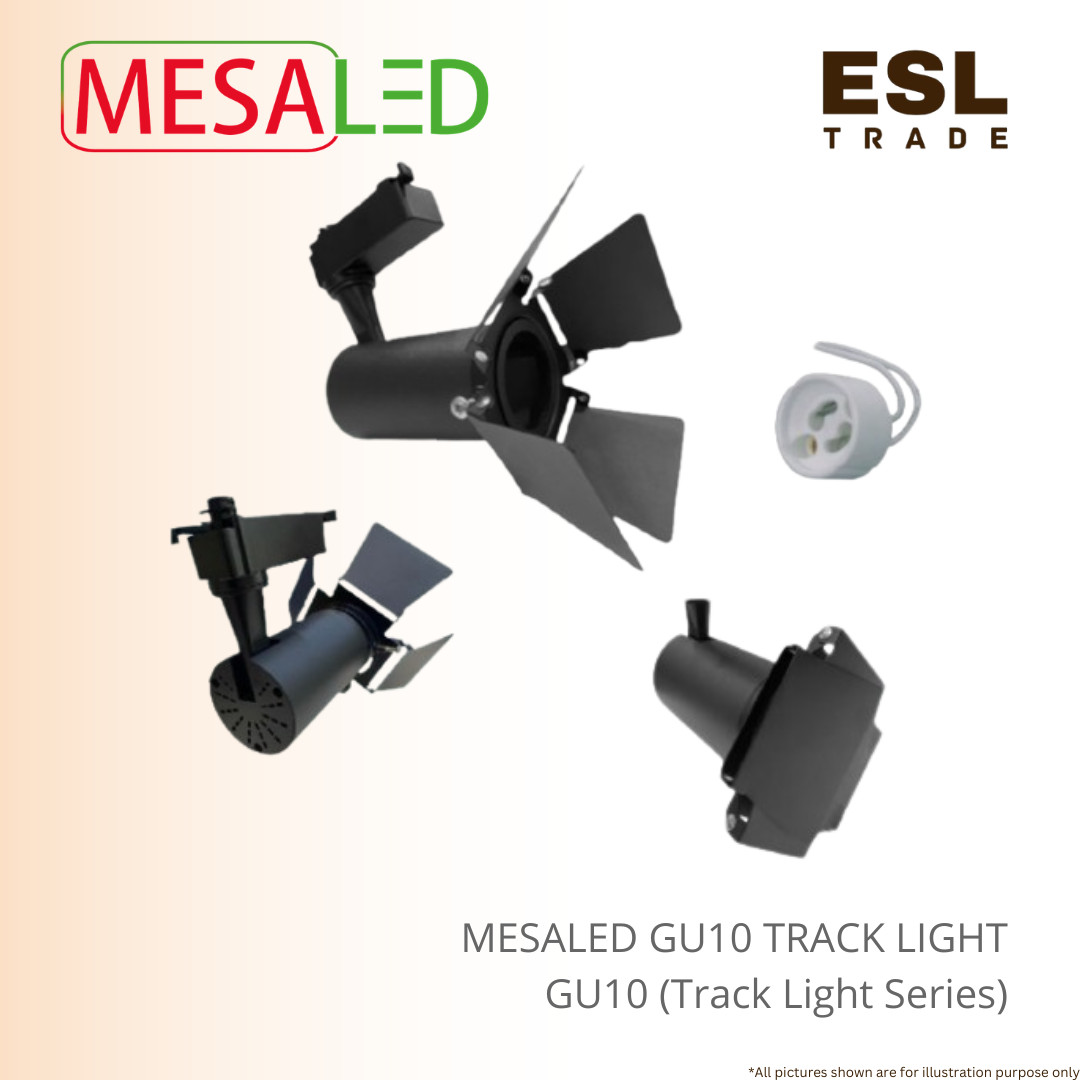 The MESALED GU10 Track Light is a professional-grade indoor spotlight featuring a durable black steel body and an iconic barn door design for ultimate light control. Equipped with a high-quality porcelain holder and an IP20 rating, this versatile fixture allows you to precisely direct and shape light, making it the perfect choice for high-end retail displays, art galleries, and modern residential accent lighting.